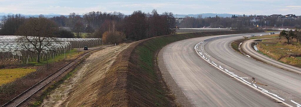 Der enorme Flächenverbrauch für eine autobahnähnliche B31neu wird derzeit beim Bau der B31-Umfahrung Friedrichshafen-West sichtbar. Nach Überzeugung des VCD könnte mit dem Bau eines zweiten Gleises für die Bodensee-Gürtelbahn so viel neue Verkehrskapazität geschaffen werden wie mit einer Autobahn.