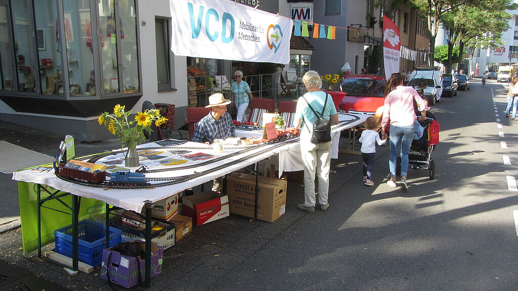 Die Modellbahn zog immer wieder auch Fußgänger von der anderen Straßenseite an, die dann zum Betrachten auf der Fahrbahn stehenblieben und so der Hauptstraße einen Hauch von Fußgängerzonen-Flair verliehen. Die vom VCD und auch von vielen Passanten gewünschte Sperrung dieses Straßenabschnitts für den Park(ing) Day war von der Stadt leider nicht genehmigt worden.
