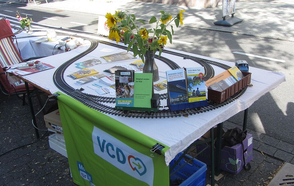 Erstmals fand in Markdorf am Donnerstag, den 20.9. eine Aktion zum internationalen Park(ing) Day statt – wegen des Markt-Tages bereits einen Tag früher als andernorts üblich. Dabei wurden bei sonnigem spätsommerlichen Wetter sechs Parkplätze an der Hauptstraße umgewidmet, begrünt und mit plakativen Aktionen umgestaltet. Organisiert hatte der VCD den Park(ing) Day gemeinsam mit dem BUND Markdorf, dem CarSharing-Verein „BodenseeMobil“ und dem Spezialrad-Händler Bobtec aus Bermatingen.