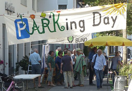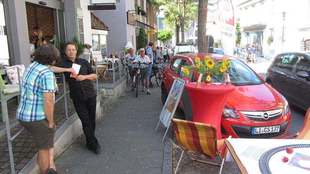 Sechs Parkplätze in der Hauptstraße wurden begrünt und mit plakativen Aktionen umgestaltet.