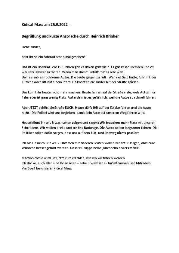 Auch die Durchführung war gut. Am Anfang hat Heinrich Brinker begrüßt und – die Kinder einbeziehend – sich vor allem an die Kinder gewandt – Martin Schmid hat danach einen sehr kurzen organisatorischen Hinweis gegeben. Am Ende haben sich alle Teilnehmer*innen kurz auf dem Marktplatz versammelt – und die Kinder hatten die Möglichkeit, auf dem Hochrad mal Probe zu sitzen.