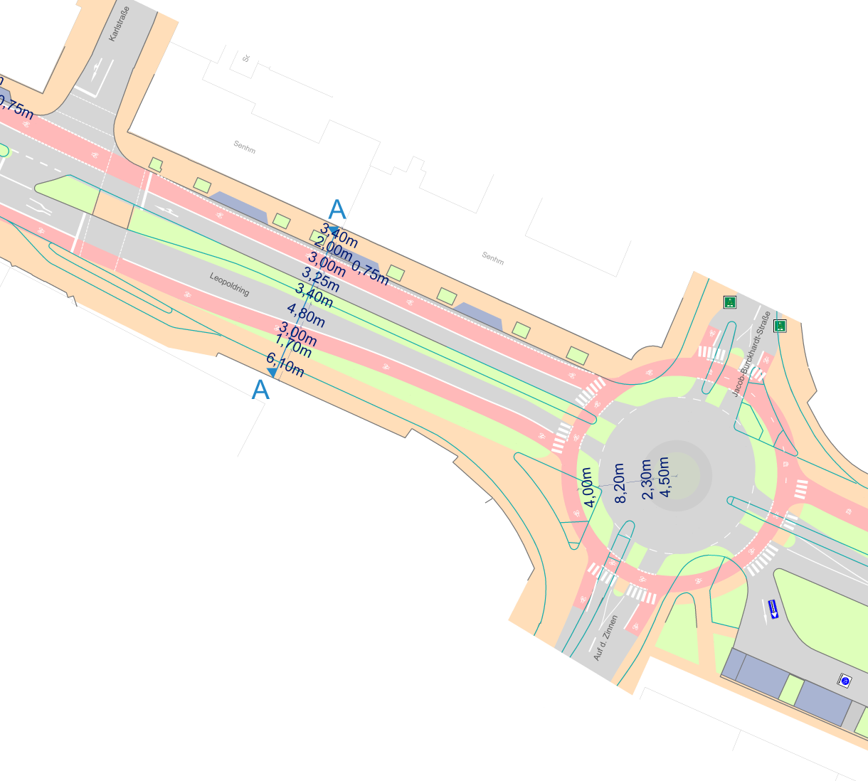 In der von uns vorgeschlagenen Option wird der zwei-Richtungsradweg innerhalb des Kreisverkehrs durch einen Zwei Richtungs-Radweg in die Jacob-Burkhard Straße hinein umfahren. Dadurch entspricht der Kreisverkehr der Musterlösung für Kreisverkehre für das Radnetz BW für Kreuzungen mit mehr als 15.000 Kfz/24h.