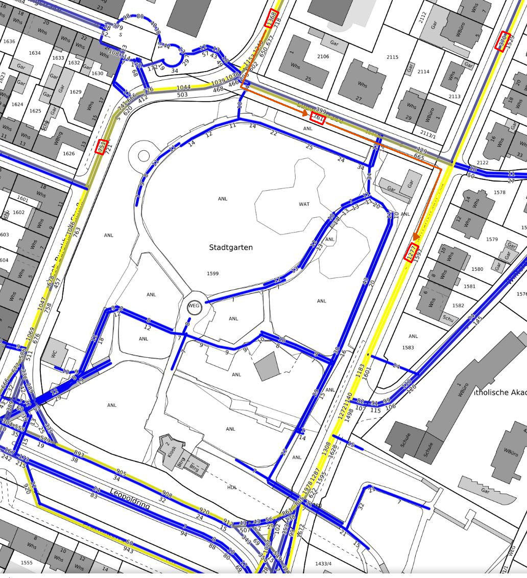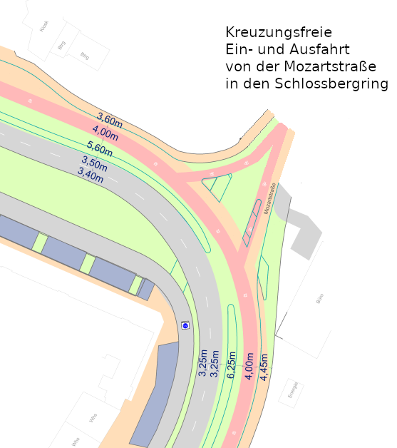 Wir halten es aber durchaus für fragwürdig, ob überhaupt sehr viele Radfahrende die in die Wiehre oder in Richtung Oberau / Littenweiler wollen in der Jacob-Burkhard Straße ankommen werden. Die Stadtradeln Daten 2023 legen nahe, dass schon heute ein Großteil der Radfahrenden von Norden den Weg über die Ludwigstraße / Mozartstraße nehmen um in den Schlossbergring zu kommen. Diese Tendenz wird durch die kreuzungsfreie Einfahrt des Radverkehrs von der Mozartstraße (siehe Bild) in den Schlossbergring noch einmal verstärkt und kann durch verkehrsleitende Maßnahmen weiter verstärkt werden. Außerdem ermöglicht uns diese Variante eine großflächige Entsiegelung und die Möglichkeit den Stadtgarten wieder etwas von seiner ursprünglichen Größe zurück zu geben.