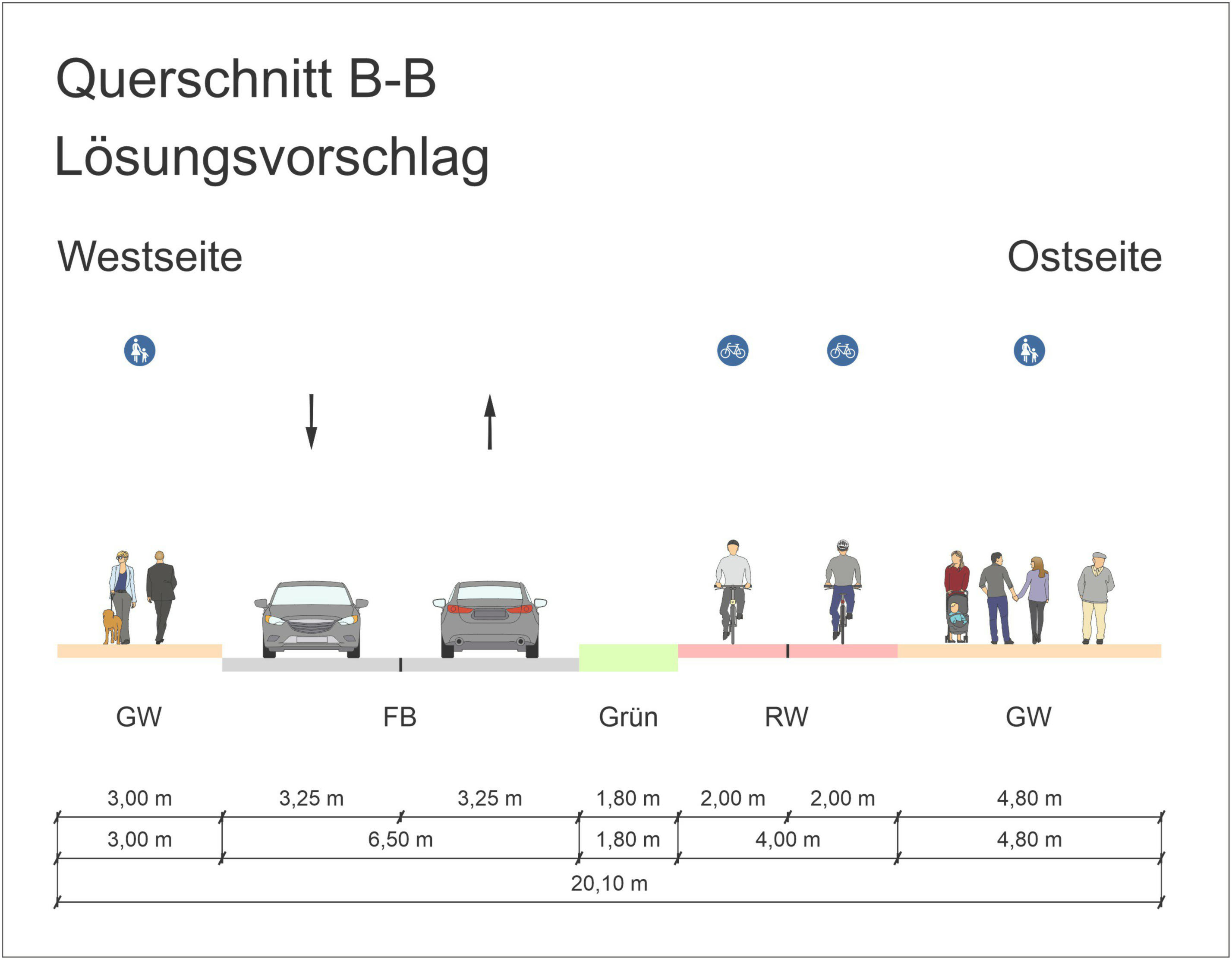 Wir halten die Variante 2 für nicht leistungsfähig und gefährlich für den Radverkehr. Nur eine Weiterentwicklung der Variante 1 ermöglicht die sichere und schnelle Radverkehrsverbindung zwischen dem Norden und Osten der Stadt.