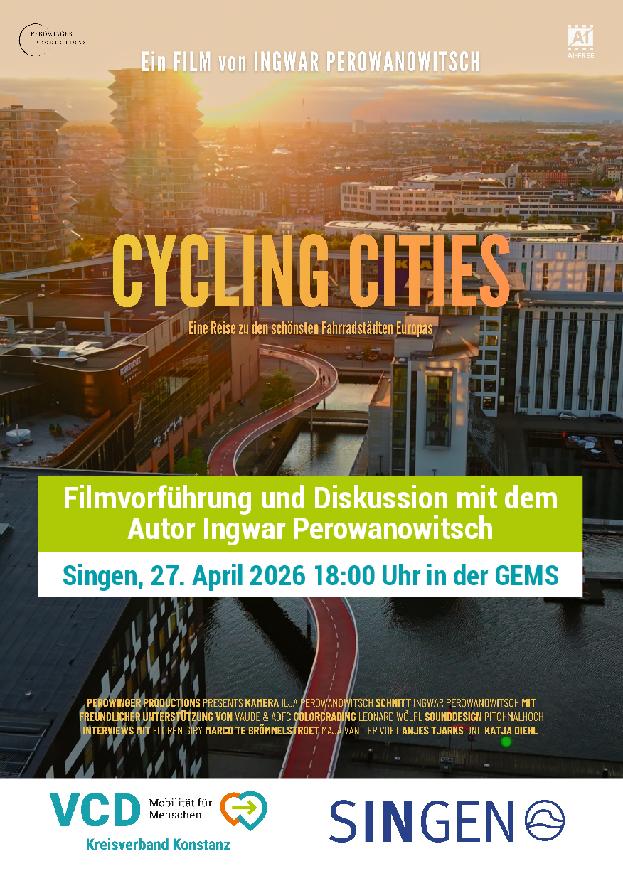 Der Verkehrsclub Deutschland (VCD) Kreisverband Konstanz lädt gemeinsam mit der Stadt Singen zu einer besonderen Filmvorführung ein. Gezeigt wird der Dokumentarfilm Cycling Cities.
