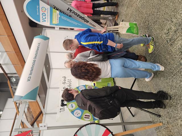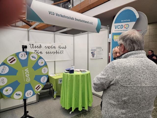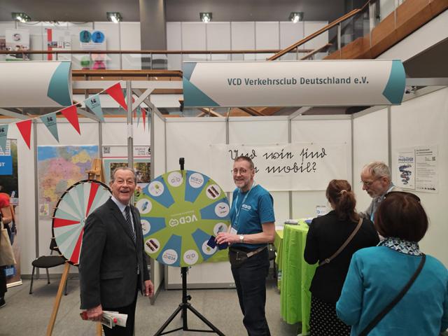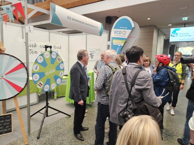 Das Banner war ein Hingucker: “Wie sind Sie mobil?” stand da in Sütterlinschrift - passend für einen Seniorentag. Die Älteren haben die noch in der Schule gelernt, jüngere Besucher und Besucherinnen schauten dagegen überwiegend ratlos. Aber am Glücksrad gab es für alle als Belohnung für eine richtige Antwort (und teilweise auch als Trostpreis) wahlweise einen Kugelschreiber oder ein (Weingummi-)Fahrrad. Beim Deutschen Seniorentag im Mannheimer Rosengarten herrschte am VCD-Stand drei Tage lang reger Betrieb - und im Publikum waren auch viele jüngere Personen.