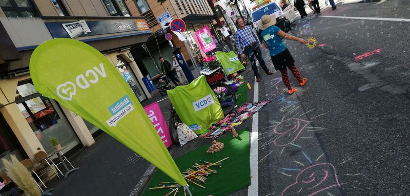 Beim diesjährigen Parking Day konnten die vielen Initiativen, Vereine und Privatleute nicht nur die Parkplätze auf beiden Seiten der Fressgasse für Spiel, Spaß und mehr Grün nutzen, sondern gleich den ganzen Straßenraum. Entlang der Quadrate Q1-Q3 war der letzte Samstag von 11 bis 18 Uhr ein Ort der Begegnung und Kommunikation – so schön könnte es sein – fast überall in der Stadt. Wir vom Verkehrsclub Deutschland, diesmal als Gemeinschaftsaktion des VCD Rhein-Neckar mit dem VCD Elbe-Saale, fragten uns, wo die Menschen in ihren meist sehr dicken Autos hinfahren wollten, als sie sich vor 11 Uhr noch an unseren Aktionsflächen auf den Parkplätzen vorbeistauten.