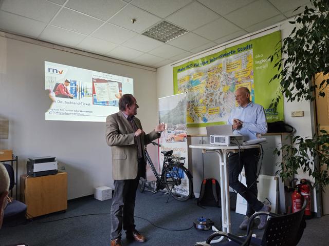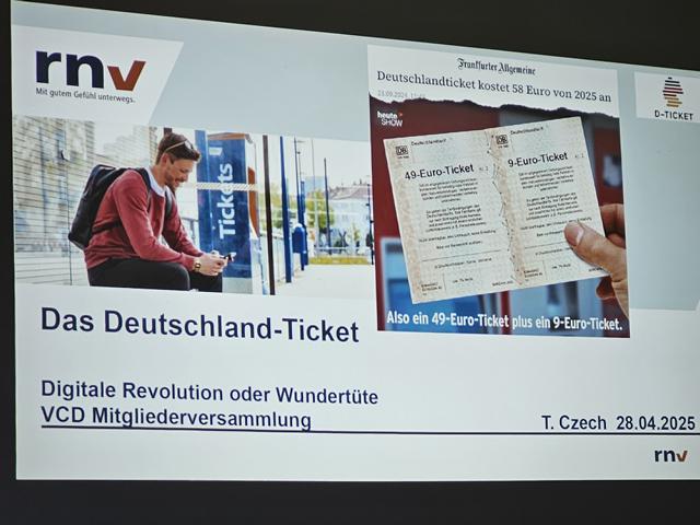 Zu Beginn unserer diesjährigen Mitgliederversammlung gab Thomas Czech von der RNV (Rhein-Neckar-Verkehr GmbH) einen interessanten Überblick über Vorteile und Probleme des Deutschlandtickets aus Sicht eines großen Nahverkehrsunternehmens. Im formalen Teil der Versammlung wurden die bisherigen Vorstandsmitglieder in Ihren Ämtern bestätigt, Jannick Heilck vom jungVCD wurde als fünftes Mitglied neu in den Vorstand gewählt. Der Rechenschaftsbericht für das abgelaufene Jahr steht hier.
