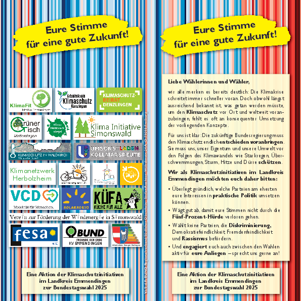 Zusammen mit 17 anderen Klimaschutzinitiativen im Landkreis Emmendingen hat der VCD einen gemeinsamen Flyer zur Bundestagswahl 2025 herausgebracht.
