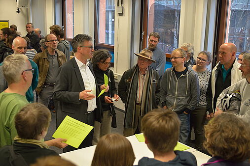 Gut kam der zentrale Teil der Veranstaltung bei Kandidaten und Besuchern an, zu jeweils abgegrenzten Themen in das direkte Gespräch zu kommen. Der Austausch zu Klimaschutz, Gesundheit, städtischer Raum, öffentlicher Verkehr sowie Fahrrad- und Fußverkehr geriet überaus intensiv, wie die Kandidaten anschließend dem Plenum berichteten. In Zweierteams gaben sie eine Kurzfassung ihrer Gesprächsrunden. Natürlich ließen sie dabei auch ihre persönlichen Vorstellungen deutlich werden.