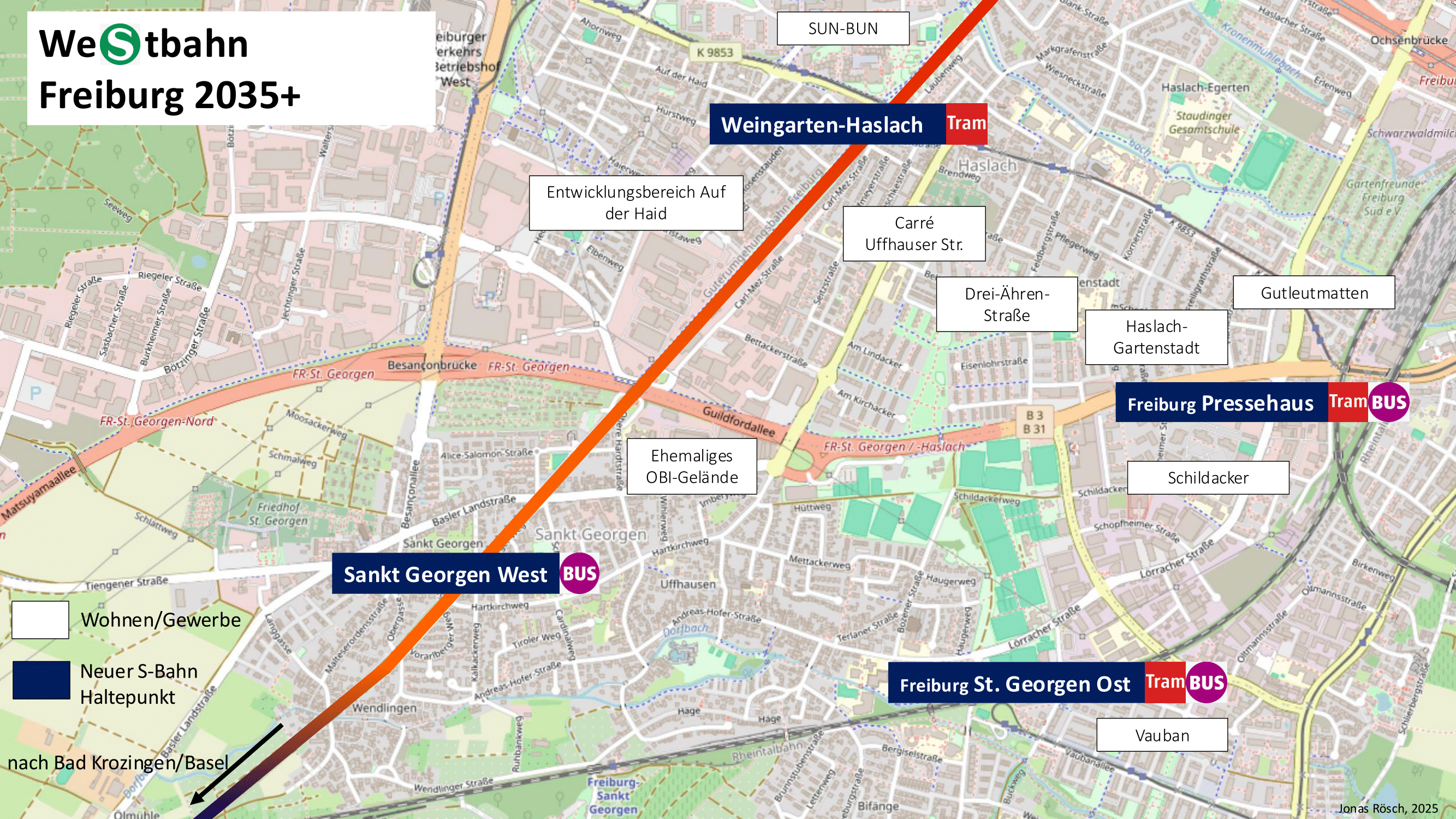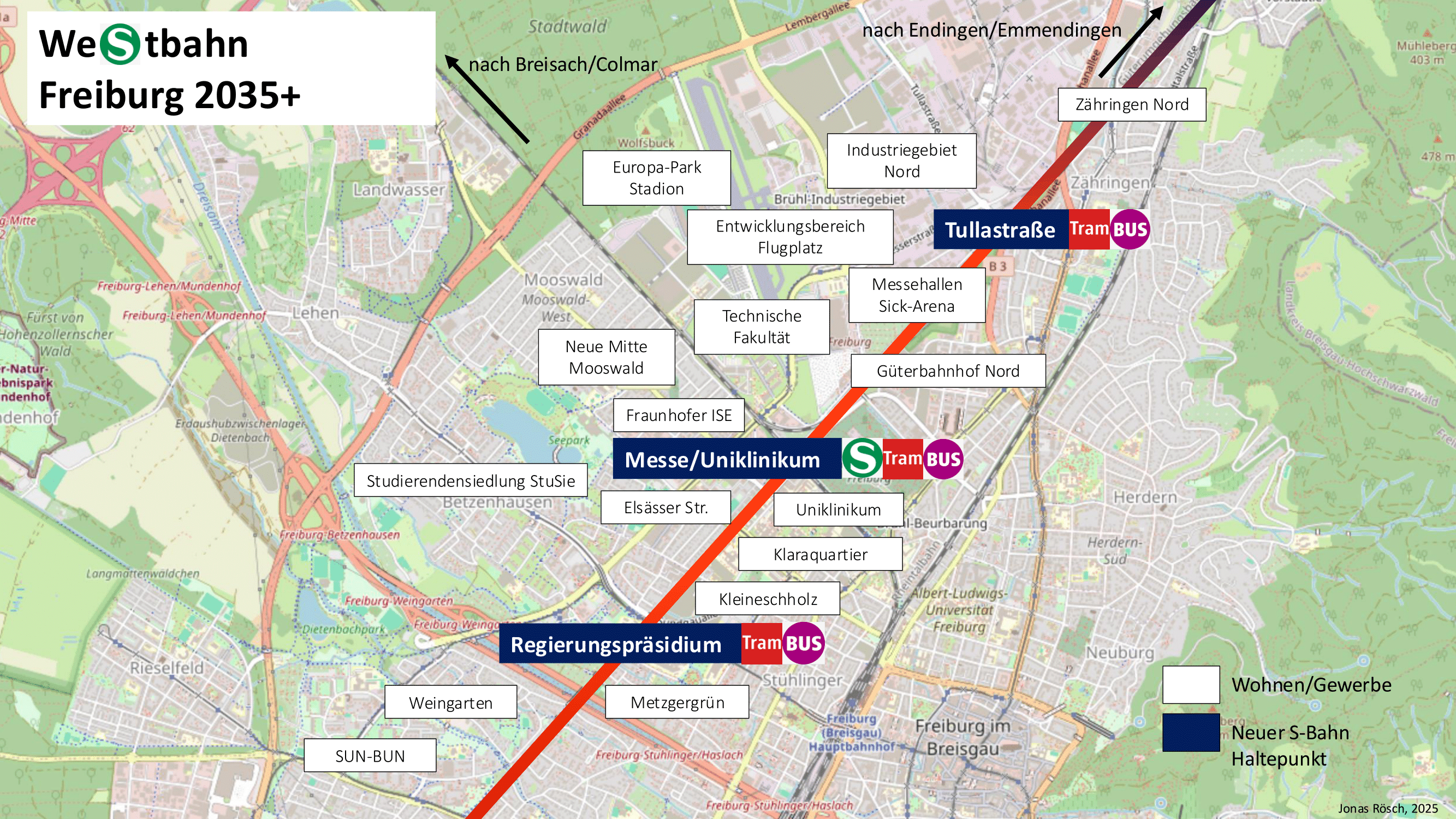 Freiburg, 02. Juni 2025. Die Deutsche Bahn plant Großes: Der Güterverkehr soll ab 2035 entlang der Autobahn geführt werden. Die alten Gütergleise im Westen Freiburgs werden dadurch frei. Diese einmalige Chance ermöglicht eine neue S-Bahn-Verbindung durch den Westen der Stadt – die sogenannte Westbahn – und könnte zehntausenden Menschen in Freiburg und der Region direkte Bahnverbindungen zu Arbeitsplätzen, medizinischer Versorgung und Freizeitangeboten bieten.