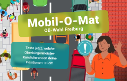 Freiburg, 02. April 2026. Heute schaltet die Freiburger VCD-Ortsgruppe den Mobilomat zur Benutzung frei. Das einfache Online-Fragespiel funktioniert wie der bekannte Wahl-O-Mat, konzentriert sich aber ganz auf das Thema Mobilität und die Stadt Freiburg. Das Tool ist ab heute unter www.mobilomat-freiburg.de erreichbar. Interessierte können mit wenigen Klicks prüfen, welche Kandidierenden ihre Wünsche bei Themen wie Radverkehr, Bus und Bahn oder Parkgebühren am besten vertreten. Wie beim Wahl-O-Mat ist das Ergebnis nicht als Wahlempfehlung zu verstehen, sondern dient lediglich als Orientierungshilfe.