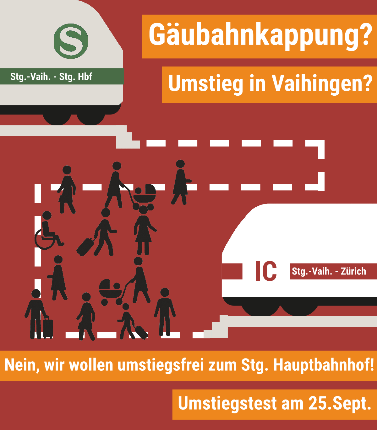 Die Gäubahn soll ab März 2027 abgehängt werden. Die Züge würden dann nicht mehr bis Stuttgart Hbf durchfahren, sondern in Stuttgart-Vaihingen enden. So muss eine komplette IC/RE-Besetzung auf eine sowieso schon volle S-Bahn umsteigen. Um zu zeigen, wie wenig fahrgastfreundlich und umständlich das ist, simuliert das Pro Gäubahn Landesbündnis zusammen mit dem ökologisch orientierten Verkehrsclub Deutschland (VCD) am 25. September diesen Umstieg. Wir wollen zeigen, wie wenig die schmalen Treppen und ein Aufzug am Bahnhof Vaihingen dafür geeignet sind, dass ein voller IC mitsamt Kinderwägen, Rollatoren und Fahrrädern den Bahnsteig wechselt und sich dann in eine volle S-Bahn drängen muss. Mit dieser Aktion wollen wir auch in der Öffentlichkeit und der Politik klarstellen, dass die geplante Gäubahn-Kappung unzumutbar ist und storniert werden muss.