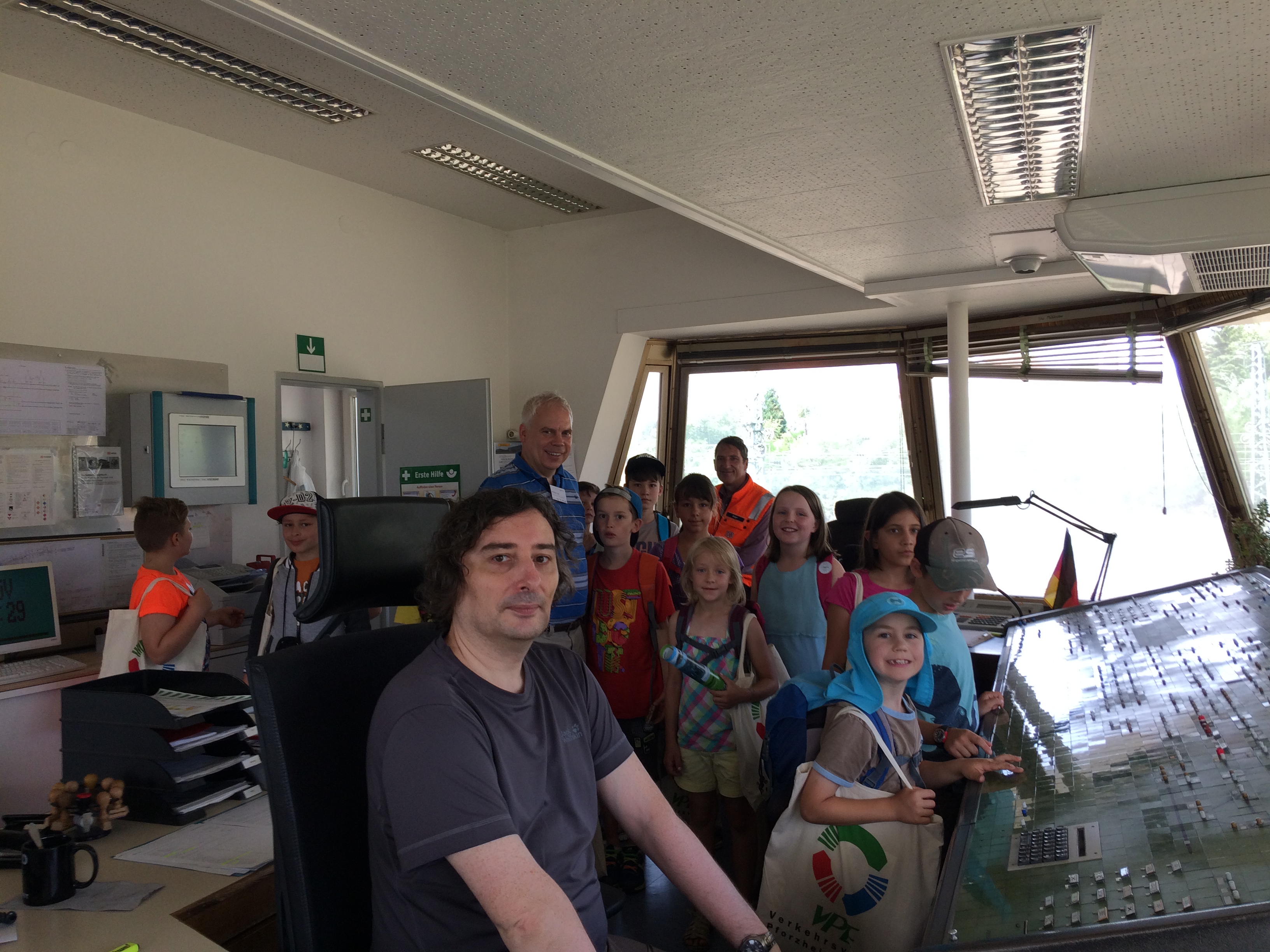Unter dem Motto „Wie funktioniert die Eisenbahn“ stand am Sonntag das Maulbronner Kinderferienprogramm. In diesem Jahr organisierte der Verkehrsclub Deutschland (VCD) eine Fahrt mit dem Klosterstadt-Express von Maulbronn direkt vor das Stellwerk in Mühlacker. Dort erläuterte Uwe Geiger von der DB Netz AG den Kindern, wie das Stellwerk funktioniert. Unter der fachkundigen Aufsicht durften die Kinder selbst Weichen und Signale stellen. Matthias Lieb vom VCD erklärte Fahrplan und Tarife - so kann in den Sommerferien eine ganze Familie für 5,50 € mit dem Klosterstadt-Express von Maulbronn nach Pforzheim fahren – und wieder zurück. Eine Familien-Tageskarte z.B. nach Bad Wildbad kostet 10 €. Am Fahrkartenautomaten konnten die Kinder eine Fahrplanauskunft zu ihrem Urlaubsziel ausdrucken – zum Bodensee, ins Emsland, nach Rügen oder nach Kroatien. Begeistert waren die Kinder vom Hublift am Klosterstadt-Express, der eigentlich für Rollstuhlfahrer vorgesehen, aber auch zum Aussteigen beim Halt ohne Bahnsteig genutzt werden kann.