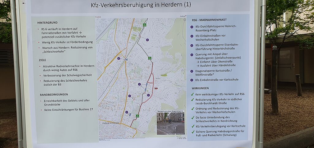Innerhalb von Freiburg wirkt die Planung ambitionierter: Der erste Abschnitt in Herdern umfasst Modalfilter, gegenläufige Einbahnstraßen und „continuous side‐walks“. Hier wurde bereits ein Förderantrag gestellt, und mit etwas Glück starten die Bauarbeiten zwischen der Unterführung Hinterkirchstraße und der Innenstadt noch 2025. Der nördliche Abschnitt birgt jedoch Schwierigkeiten. Bisher ist keine Brücke über die Reutebachgasse vorgesehen, was unweigerlich zu gefährlichen Situationen an der Eisenbahnunterführung führen wird.